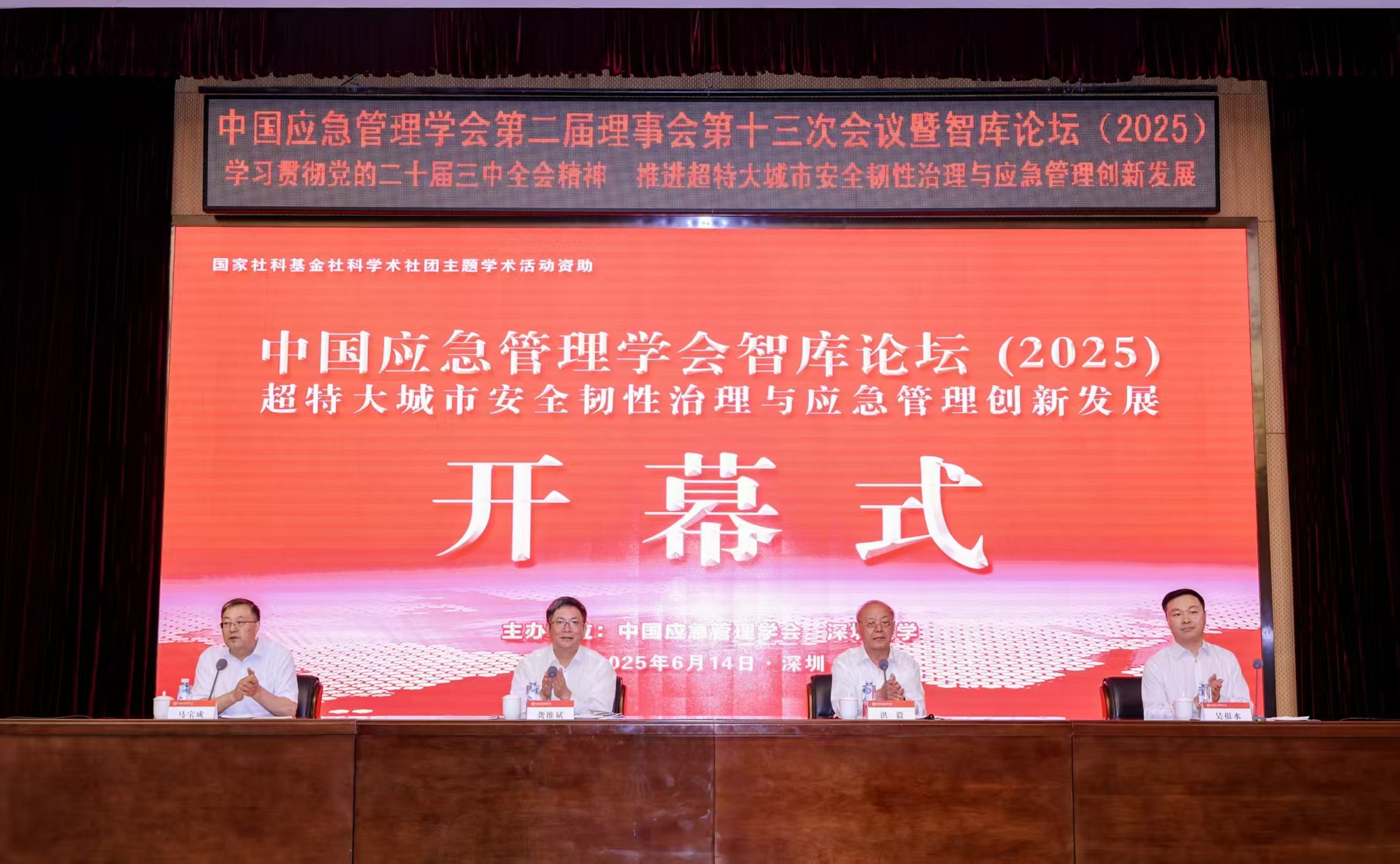2025年6月14日,中国应急管理学会与深圳大学在深圳市共同举办中国应急管理学会智库论坛(2025)。本次论坛以“学习贯彻党的二十届三中全会精神,推进超特大城市安全韧性治理与应急管理创新发展”为主题。中共中央党校(国家行政学院)副校长(副院长)龚维斌、中国应急管理学会会长洪毅、深圳大学党委副书记吴报水出席开幕式并致辞。